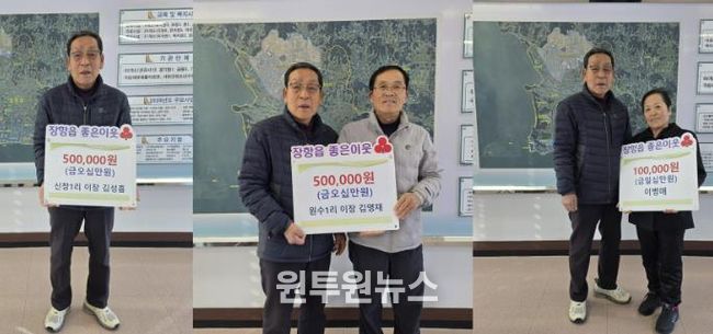 이번 후원에는 김성흠 신창1리 이장이 50만원, 김영재 원수1리 이장이 50만원, 이병애 씨가 10만원을 기부해 총 110만원의 성금이 모였다.