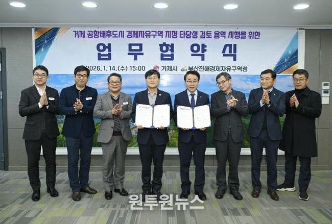 (원투원뉴스) 거제시는 14일, 부산진해경제자유구역청(청장 박성호)과 경제자유구역 거제 확대를 위한 협력체계 구축 및 타당성 검토 용역 공동 추진을 위한 협약을 체결했다.
