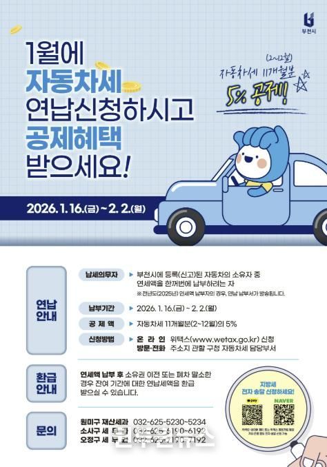 신청 대상은 1월 1일 기준 부천시에 등록된 자동차 소유자다. 연납을 희망하는 시민은 1월 16일부터 2월 2일까지 위택스를 이용하거나, 관할 구청 자동차세팀으로 전화 또는 방문해 신청하고 납부할 수 있다.