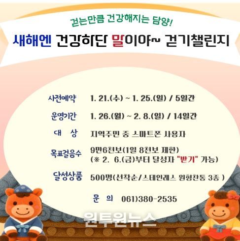 (원투원뉴스) 담양군은 2026년 새해를 맞아 오는 1월 26일부터 2월 8일까지 온라인 걷기 챌린지 ‘새해엔 건강하단 말이야’를 운영한다고 밝혔다.