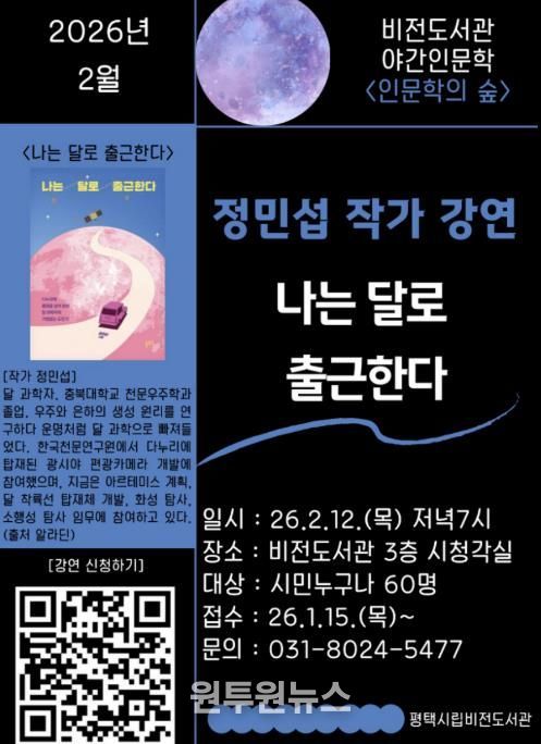 (원투원뉴스) 평택시 비전도서관은 오는 2월 12일 저녁 7시 달 과학자 정민섭 작가를 초청하여 ‘나는 달로 출근한다’를 주제로 야간 인문학 강연을 진행한다.