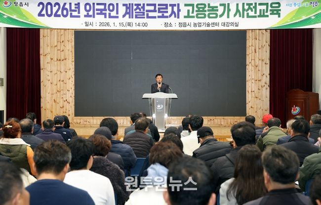 (원투원뉴스) 정읍시는 15일 농업기술센터에서 2026년도 법무부 배정 농가를 대상으로 외국인 계절근로자 프로그램 사전 교육을 진행했다.