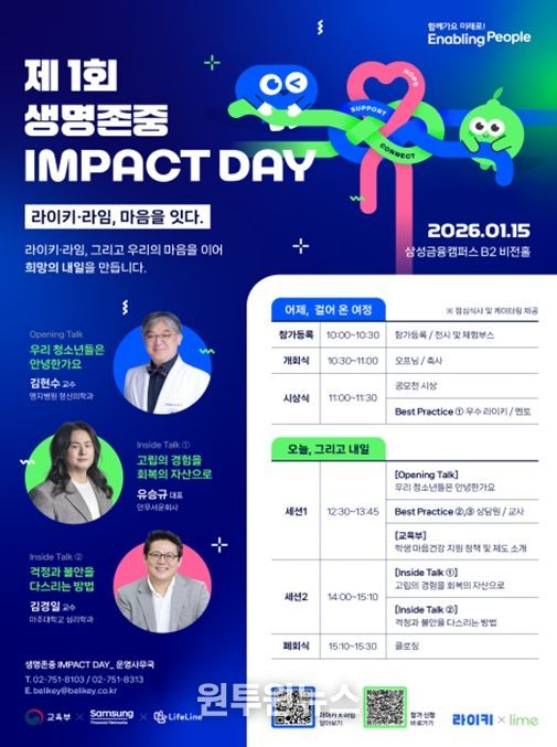 이번 행사는 ‘삼성금융네트웍스’와 ‘생명의전화’가 공동 주최하고 교육부가 후원하는 자리로, 학생 마음건강 지원을 위한 사회공헌 사업의 성과를 공유하고 민·관이 협력하는 우수모델(‘라이키’, ‘라임’)*의 사회적 가치를 조명하기 위해 마련됐다. 이날 행사에는 국회의원, 기업 임원, 학계 전문가, 라이키 프로젝트에 참여한 학교장‧교사‧학생‧대학생 멘토, 라임 상담원 등 200여 명이 참석한다.