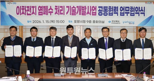 (원투원뉴스) 포항시는 15일 시청 중회의실에서 이차전지 염폐수 처리를 위한 기술개발 공모사업에 대비한 ‘이차전지 염폐수 처리 기술개발 공동협력 업무협약’을 체결했다.