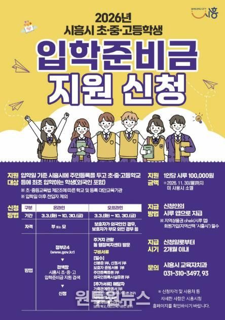 (원투원뉴스) 시흥시는 올해부터 관내 초중고 입학 자녀 가정에 입학준비금을 10만 원씩 지원한다. 이번 지원은 도서나 문구류 등을 새로 마련해야 하는 신입생 가정의 경제적 부담을 줄여주고, 교육 기본권을 강화하고자 추진됐다.