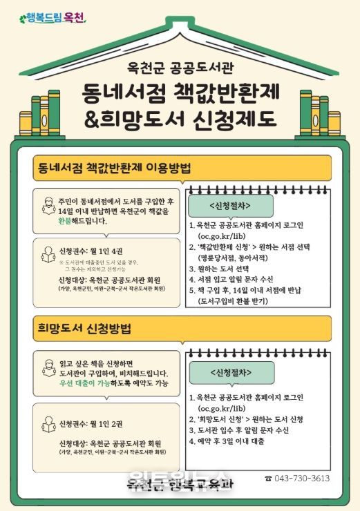 (원투원뉴스) 옥천군에서 운영하는 ‘동네서점 책값반환제’와 ‘희망도서 신청제도’가 군민들의 높은 호응을 얻고 있으며, 지역 독서문화 활성화에 기여하고 있다.