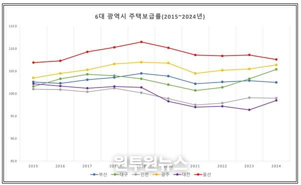 울산은 지난 2015년 이후 2024년까지 10년간 주택보급률이 100%를 넘었으며, 6대 광역시 중 가장 높은 수치를 기록했다.