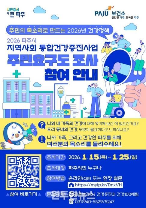 (원투원뉴스) 파주시는 시민의 건강한 삶을 지원하기 위해 '2026년 지역사회 통합건강증진사업’추진에 앞서 주민건강요구도 조사를 실시한다.
