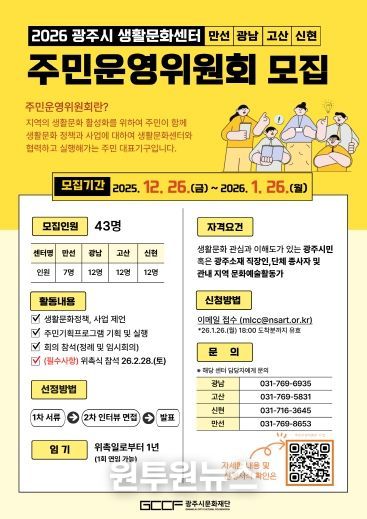(원투원뉴스) (재)광주시문화재단은 광주시 생활문화센터(만선·광남·고산·신현)에서 2026년에 활동할 주민운영위원회 위원을 통합 공개 모집한다고 밝혔다.