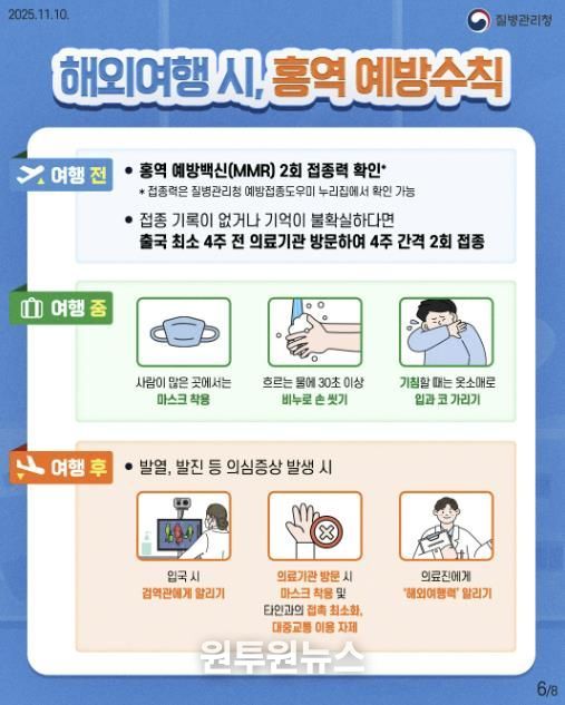 또한, 여행 중에는 손 씻기와 마스크 착용 등 개인위생을 철저히 하고, 여행 후 3주 이내 발열, 발진 등 홍역 의심 증상이 나타나면 반드시 마스크 착용 등 개인위생을 지키고 가까운 의료기관을 방문해야 하며, 진료 시에는 최근 해외여행 이력을 반드시 알려야 한다.