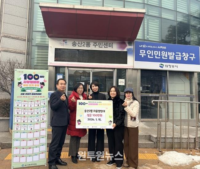 (원투원뉴스) 의정부시 송산2동주민센터는 1월 15일 송산2동 자율방범대가 ‘100일간 사랑릴레이 배턴 잇기’의 일환으로 성금 100만 원을 기탁했다고 밝혔다.