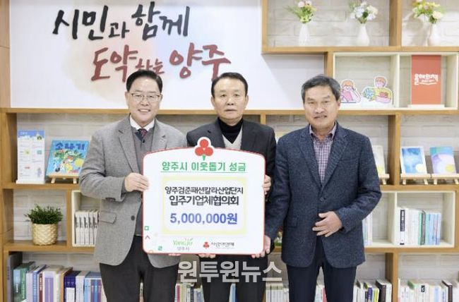 (원투원뉴스) 양주시가 지난 15일 시장실에서 양주검준패션칼라사업협동조합을 비롯한 관련 단체 및 기업으로부터 이웃돕기 성금과 성품을 기탁받았다고 밝혔다.