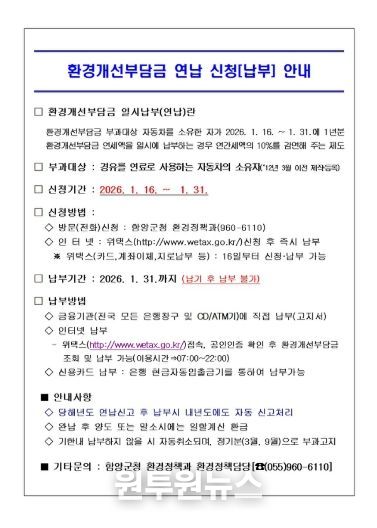 (원투원뉴스) 함양군은 경유를 연료로 사용하는 자동차(2012년 3월 이전 제작·등록에 한함)에 매년 3월과 9월 부과되는 환경개선부담금의 일시 납부(연납)를 1월 31일까지 접수 받고 있다.