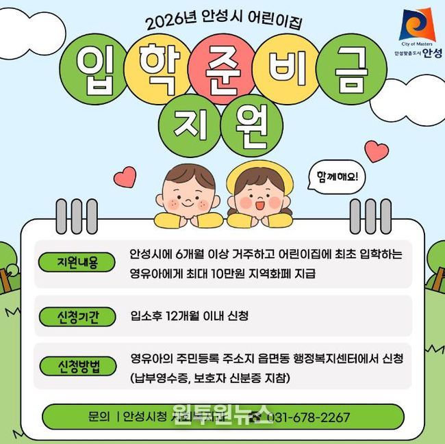 (원투원뉴스) 안성시는 2026년부터 어린이집 입학준비금 지원사업을 시행한다고 밝혔다.