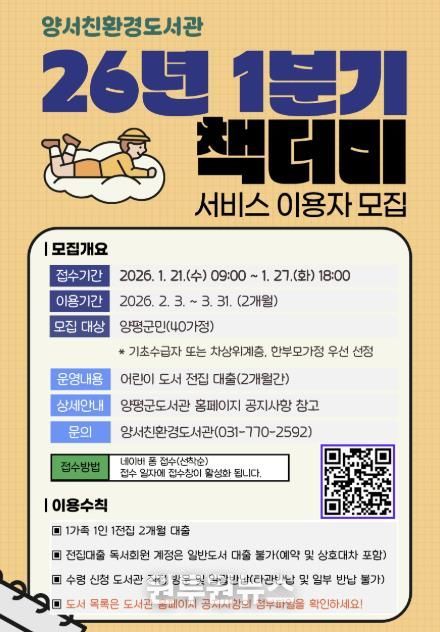 모집 대상은 양평군 도서관 대출회원 중 어린이 자녀를 둔 40가정이며, 기초생활수급자 및 차상위계층, 한부모 가정은 우선 선정 대상에 포함된다. 신청은 1월 21일 오전 9시부터 온라인(네이버 폼)을 통해 선착순으로 진행된다.