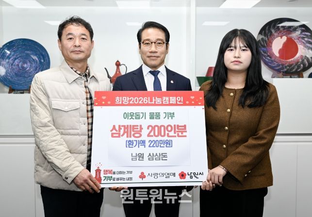 남원시 관계자는 “오랜 기간 꾸준한 나눔을 실천해 온 삼삼돈의 따뜻한 마음에 깊이 감사드린다”라며 “기탁해 주신 삼계탕은 식생활이 어려운 분들께 소중히 전달해 실질적인 도움이 될 수 있게 하겠다”라고 전했다.