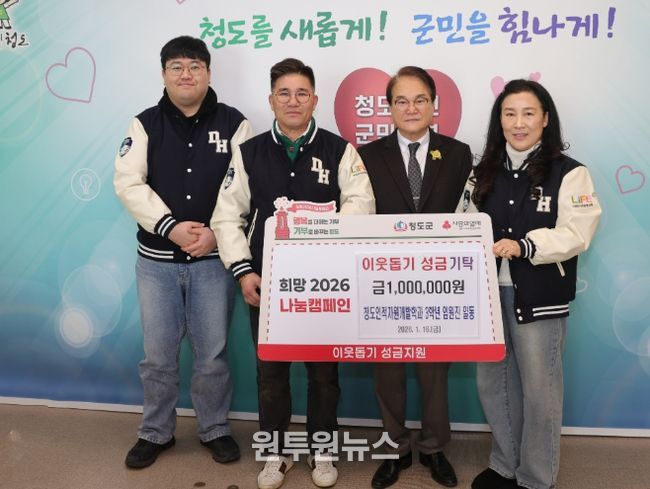 (원투원뉴스) 대구한의대학교 청도인적자원개발학과 3학년 임원진들(과대표 조형석)은 지난 16일 희망2026 나눔캠페인 이웃돕기 성금 100만원을 청도군에 전달했다.