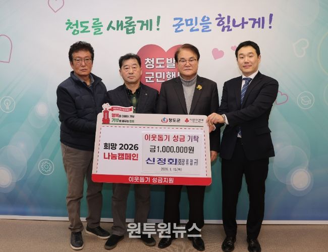 (원투원뉴스) 청도 신정회(회장 류점규)는 지난 15일 희망2026 나눔캠페인 이웃돕기 성금 100만원을 청도군에 전달했다.
