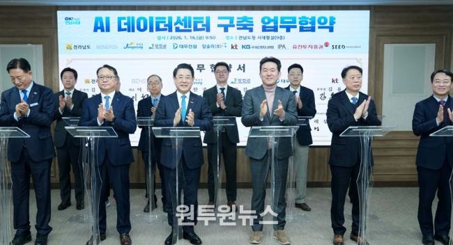 (원투원뉴스) 전라남도는 16일 장성군·강진군, 민간 참여 기관과 함께 ‘AI 데이터센터 구축을 위한 업무협약’을 했다.