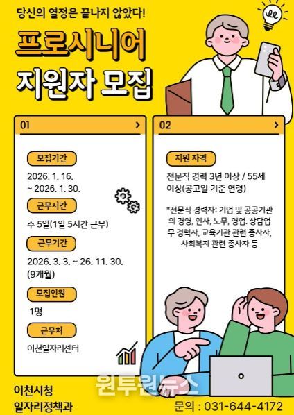 이천시 관계자는 “이번 프로시니어 모집은 경험 많은 중장년 인력이 지역 일자리 정책의 중요한 연결고리 역할을 하게 될 것”이라며 “전문성과 책임감을 갖춘 분들의 많은 관심과 참여를 바란다”라고 말했다.