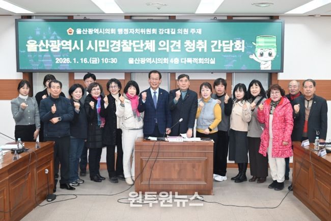 (원투원뉴스) 울산시의회 강대길 의원은 16일 의회 4층 다목적회의실에서 주민, 시민경찰단체, 경찰위원회ㆍ경찰청 관계 부서 등과 함께 ‘울산광역시 시민경찰단체 의견 청취’ 간담회를 개최했다.