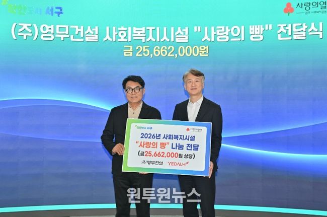 김이강 서구청장은 “정기적인 후원을 통해 따뜻한 나눔을 실천해 주신 ㈜영무건설에 깊이 감사드린다”며 “민관이 함께하는 이러한 나눔이 지역 복지안전망을 더욱 촘촘하고 단단하게 만드는 큰 힘이 될 것이다”고 전했다.