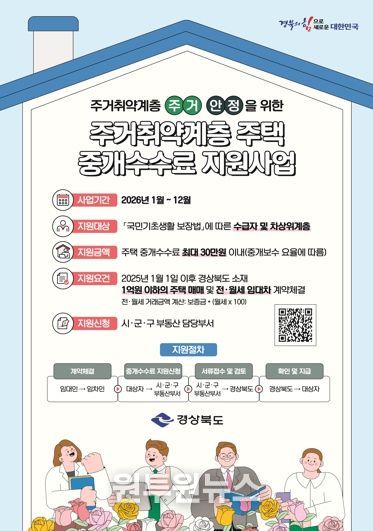 구비서류는 ▴수급자 증명서 또는 차상위계층 확인서 ▴주민등록등본 ▴매매·임대차 계약서 ▴중개수수료 영수증 ▴통장 사본 ▴개인정보 제공 동의서 등이며, 사업과 관련한 자세한 사항은 경상북도 누리집에서 확인할 수 있다.
