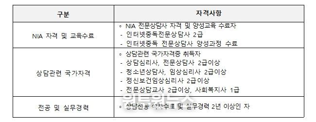선발 자격은 ▲한국지능정보사회진흥원 시행 인터넷 중독 전문상담사 2급 자격증 소지자 ▲인터넷중독 전문인력 양성교육 이수자 등 관련 자격을 갖춘 인력이다.