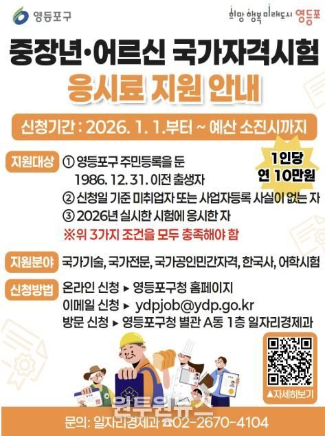 (원투원뉴스) 영등포구가 구민의 취‧창업 역량 강화를 위해 청년부터 중장년‧어르신까지 전 연령 구직자를 아우르는 ‘국가자격시험 응시료 지원 사업’을 추진한다고 밝혔다.