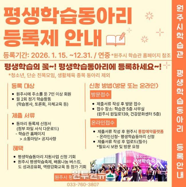 (원투원뉴스) 원주시 평생교육원 학습관은 관내에서 활동하고 있는 잠재적 평생학습동아리를 발굴하기 위해 ‘평생학습동아리 등록제’를 운영하고 있다.