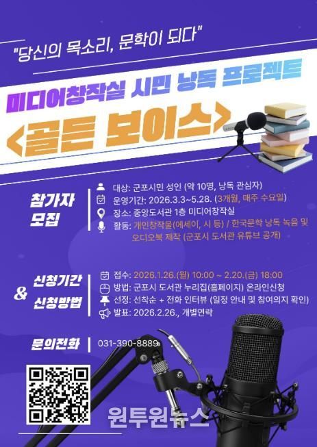 (원투원뉴스) 군포시 중앙도서관은 시민이 직접 참여하는 낭독 콘텐츠 제작을 통해 공공 문화콘텐츠를 확산하고, 시민의 창작 경험을 지원하기 위해 미디어창작실 시민 낭독 프로젝트 '골든 보이스'를 운영한다.