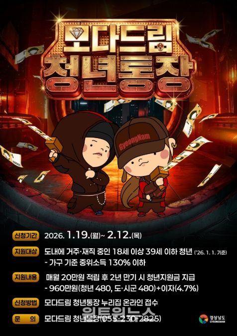 (원투원뉴스) 경상남도와 경남투자경제진흥원은 청년의 자산 형성과 지역 정착을 돕는 ‘모다드림 청년통장’ 상반기 참여자를 1월 19일부터 2월 12일까지 모집한다고 밝혔다.