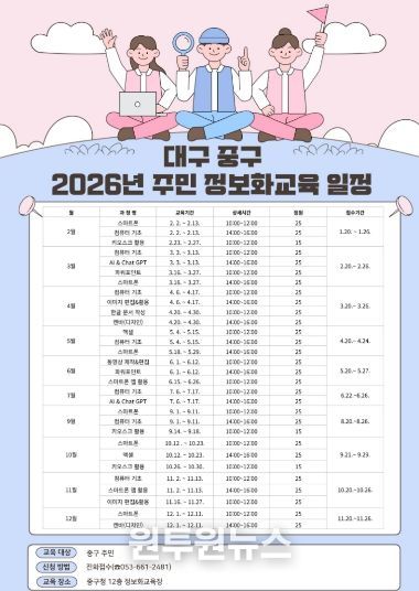 (원투원뉴스) 대구 중구는 주민의 디지털 활용 역량을 높이고 정보 격차를 해소하기 위해 오는 2월부터 구청 12층 정보화교육장에서 ‘주민 정보화교육’을 본격 운영한다.