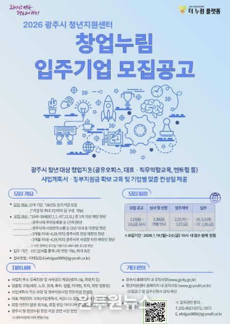 (원투원뉴스) 광주시는 지역 내 유망한 청년 창업가를 발굴하고 안정적인 창업 환경을 조성하기 위해 ‘2026년도 창업누림 신규 입주기업’을 공개 모집한다고 19일 밝혔다.