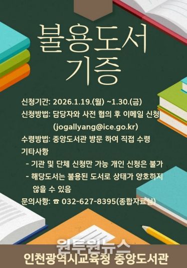 (원투원뉴스) 인천광역시교육청중앙도서관은 지역사회 내 도서 나눔 문화를 확산하고 지식 자원의 선순환을 실천하기 위해 ‘불용도서 기관 나눔’ 사업을 운영한다.