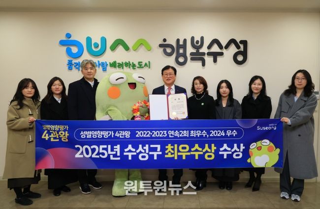 (원투원뉴스) 대구 수성구는 대구광역시가 9개 구·군을 대상으로 실시한 ‘2025년 성별영향평가 구·군 수행평가’에서 최우수상을 수상했다고 밝혔다. 이로써 수성구는 2022·2023년 최우수상, 2024년 우수상에 이어 4년 연속 우수기관으로 선정되는 성과를 거뒀다.