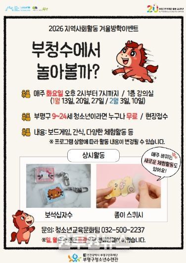 (원투원뉴스) 부평구 청소년수련관은 오는 20일부터 다음달 10일까지 겨울방학을 맞아 지역 청소년을 위한 2026 지역사회활동 겨울방학 이벤트 ‘부청수에서 놀아볼까’를 진행한다.