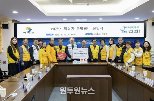 (원투원뉴스) 연천군은 지난 15일 군청 상황실에서 연천군수, 대한적십자사 경기도지사 우광호 사무처장, 연천군협의회 금가현 회장 및 회원 등이 참석한 가운데 2026년 적십자 특별회비 전달식을 개최했다.
