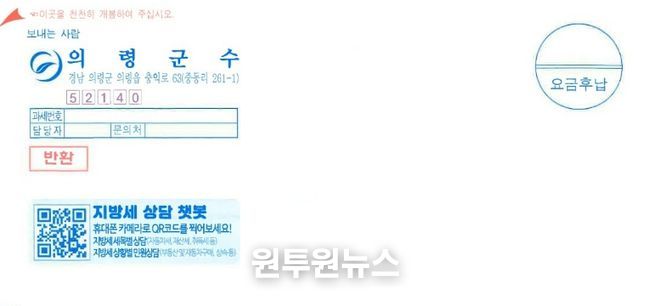 (원투원뉴스) 의령군은 지방세 고지서 전면에 ‘지방세 챗봇 상담서비스’ QR코드를 삽입해 발송한다고 밝혔다.