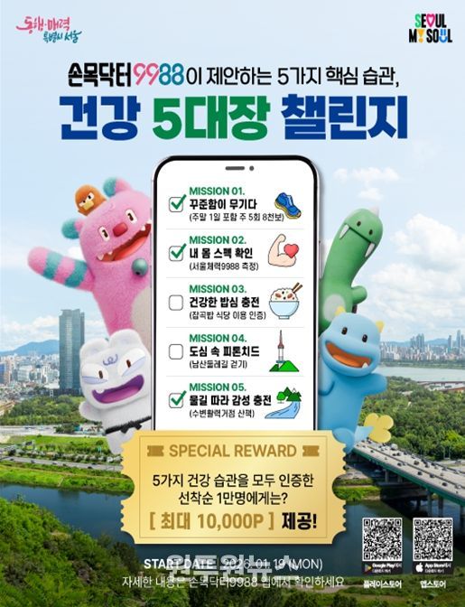 서울시는 새해를 맞아 시민들이 건강한 생활 습관을 자연스럽게 실천할 수 있도록 손목닥터9988 앱을 활용한 ‘건강 5대장 인증 챌린지’ 운영에 나섰다.