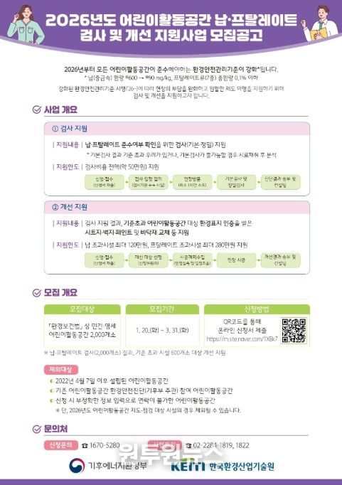 (원투원뉴스) 기후에너지환경부와 한국환경산업기술원은 어린이 활동공간에 새롭게 적용되는 환경안전관리기준에 따라 ‘납’과 ‘프탈레이트’에 대한 검사를 지원하고, 기준을 초과한 시설에 대해서는 개선 지원을 추진한다고 밝혔다.
