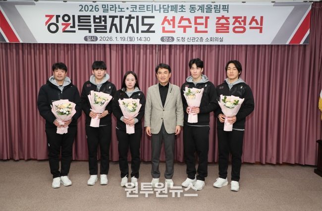 (원투원뉴스) 강원특별자치도(도지사 김진태)는 1월 19일(월) 오후 2시 30분, 도청 신관 소회의실에서 ‘2026 밀라노·코르티나담페초 동계올림픽’에 출전하는 도 선수단의 선전을 기원하는 출정식을 개최했다.