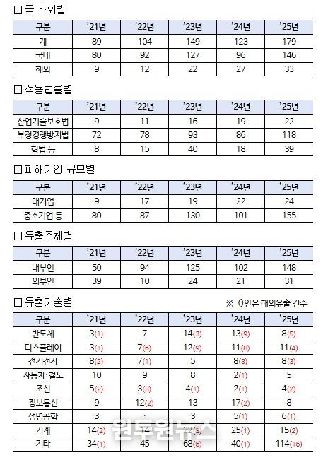 유출 주체는 피해기업 임직원 등 내부인(148건, 82.7%)이 대다수이며, 대기업(24건, 13.4%)보다는 중소기업(155건, 86.6%)이 압도적으로 많은 것으로 확인됐다.