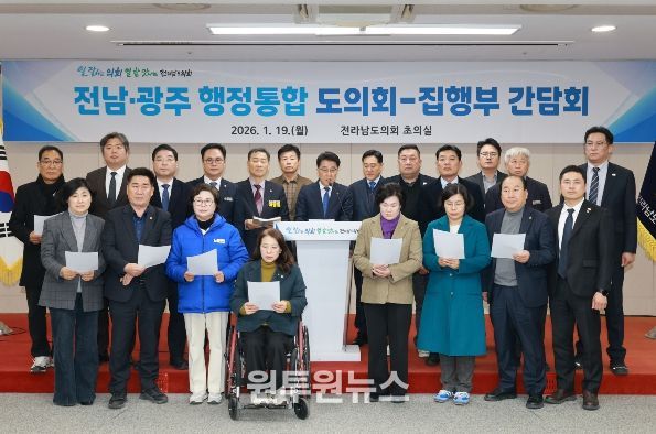 (원투원뉴스) 전라남도의회는 19일 도의회에서 김영록 전라남도지사와 김대중 전라남도교육감이 참여한 가운데 ‘전남·광주 행정통합 도의회–집행부 간담회’를 열고, 통합 추진 방향과 주요 쟁점에 대해 심도 있는 논의를 진행했다.