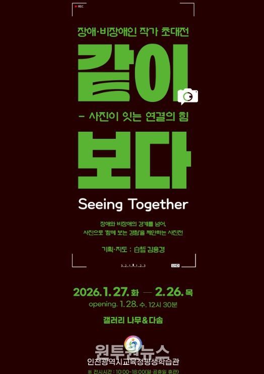 (원투원뉴스) 인천광역시교육청평생학습관은 인천 시민을 대상으로 2층 갤러리 나무와 다솜에서 ‘같이, 보다(Seeing Together) 장애인 작가 초대전’을 개최한다.