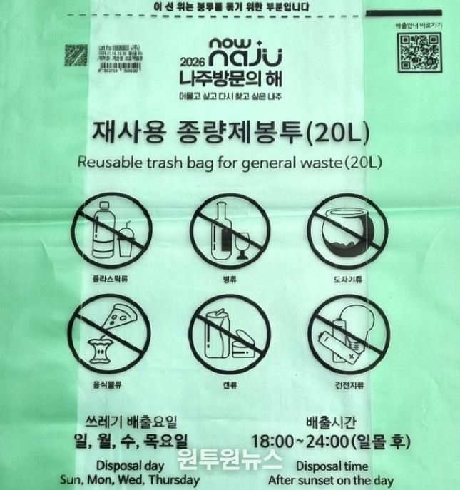 (원투원뉴스) ‘500만 나주 관광시대’를 위해 2026년을 나주방문의 해로 선포한 전라남도 나주시(시장 윤병태)가 홍보 활동의 일환으로 종량제봉투에 ‘2026 나주방문의 해’ 공식 문구와 슬로건(머물고 싶고 다시 찾고 싶은 나주)을 삽입해 시민들에게 홍보를 시작한다고 밝혔다.