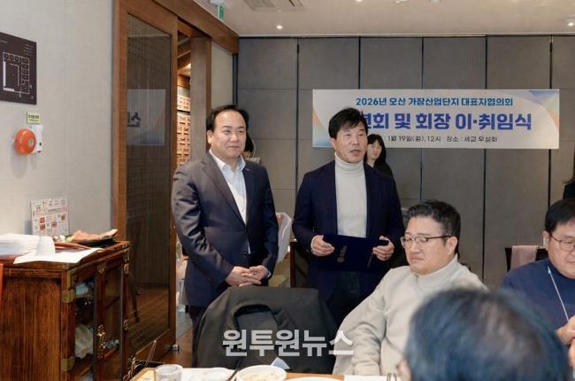 (원투원뉴스) 오산시 가장산업단지 기업인협의회는 지난 19일 정기 오찬간담회에서 2026년 신년회 및 회장 이·취임식을 개최했다고 밝혔다.