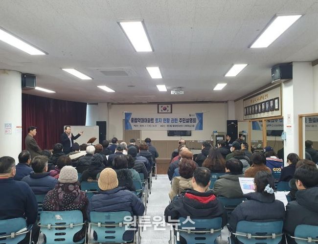 (원투원뉴스) 부천시는 지난 17일 약대동 행정복지센터에서 흥립약대아파트 주민을 대상으로 토지 지분 현황과 현대건설의 기부채납 관련 사항을 안내하는 주민설명회를 열었다.