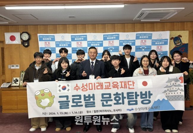 (원투원뉴스) 대구 수성미래교육재단은 지난 13일부터 16일까지 수성구 고등학생 12명을 일본 이즈미사노시에 탐방단으로 파견해 글로벌 문화 탐방 프로그램을 운영했다고 밝혔다.