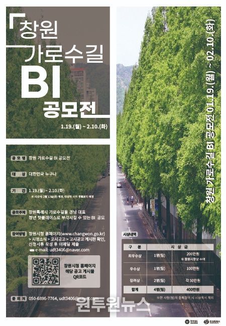 시상은 총 4명(팀)을 선정해 최우수상 1명(팀) 200만 원(창원시장상 포함), 우수상 1명(팀) 100만 원, 장려상 2명(팀) 각 50만 원을 수여할 예정이다. 참여를 희망하는 자는 창원시청 홈페이지 고시공고를 확인해 신청 서류와 원본 파일을 해당 메일로 제출해야 한다.